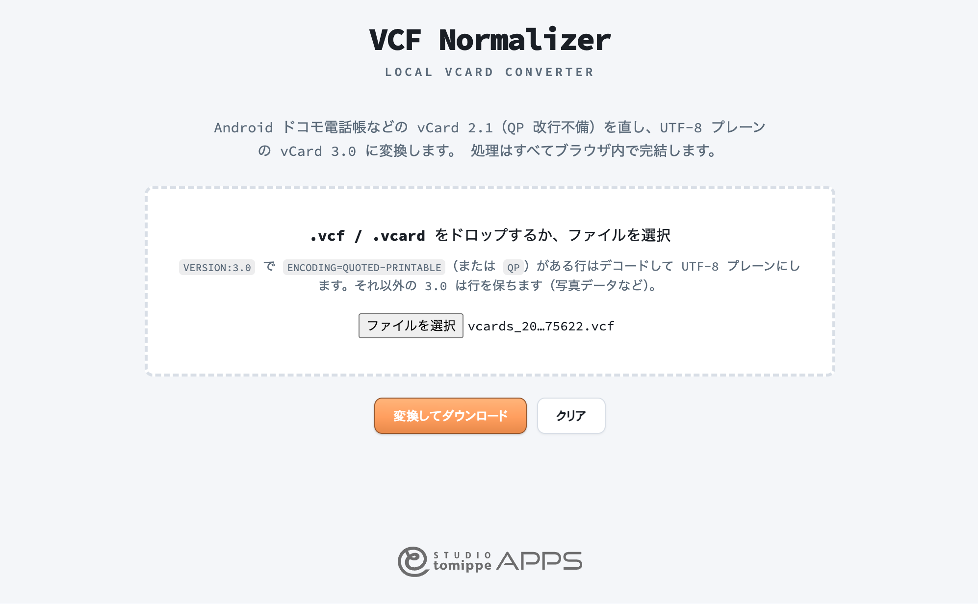VCF Normalizer は、スマートフォン・キャリア・メーラーなど由来の .vcf(vCard)を、ブラウザ内だけで UTF-8 プレーンの vCard 3.0 に整えるツールです。ファイルはサーバーに送信されません。